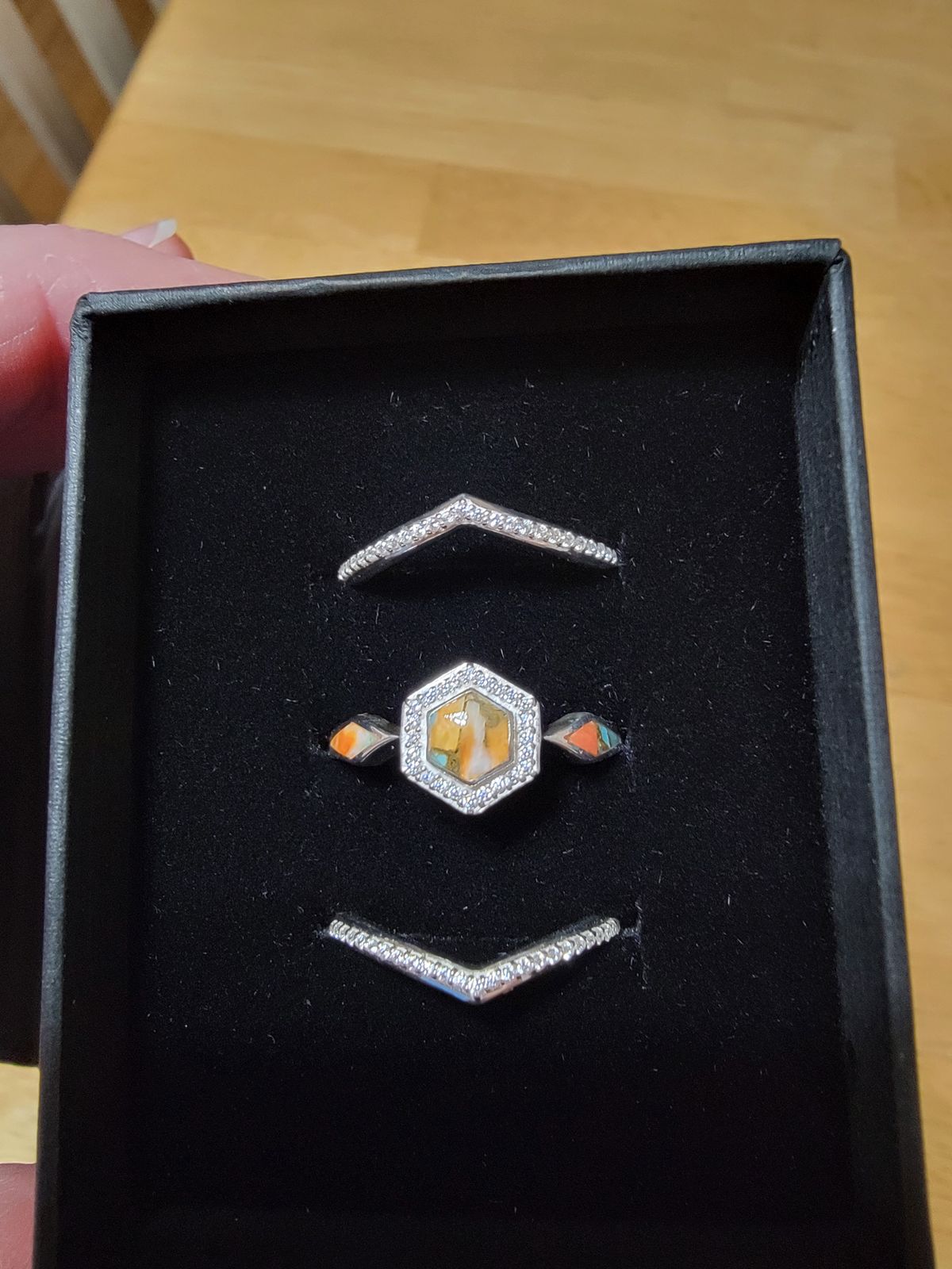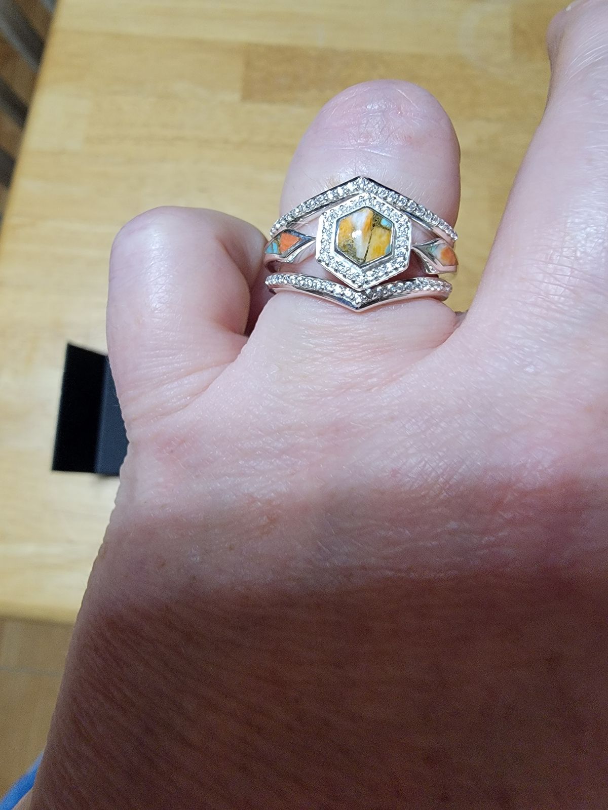 This ring was a favorite of mine but wasn’t my primal pick. This is the one my boyfriend bought to propose with and I am not disappointed! The ring is beautiful in colors! I was hoping for more teal but I also love the oranges and yellow! I also love the fact that no 2 rings are the same!